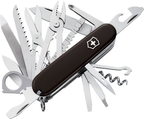 | Victorinox SwissChamp Black. #Victorinox SwissChamp Black. 3 1/2" closed. Features large blade, small blade, corkscrew, can opener with small screwdriver, reamer with sewing eye, scissors, Phillips screwdriver, magnifying glass, wood saw, fish scaler with hook disgorger and ruler (cm & inches), metal saw with metal file and nail file, bottle opener with large screwdriver and wire stripper, hook, straight pin, fine screwdriver, keyring, tweezers, toothpick, chisel, pliers with wire cutters, mini screwdriver and ball point pen.